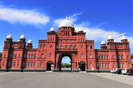 天下第一門是八里河旅游區(qū)的主園區(qū)大門。它綜合了俄、英、美三國(guó)的建筑特點(diǎn),造就了具有八里河藝術(shù)風(fēng)格的建筑,也是景區(qū)的標(biāo)志性建筑。這個(gè)樓堡式大門共有13個(gè)白色圓頂,中間一個(gè)較為突出,外墻飾有猩紅色的噴砂。