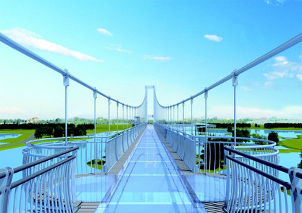 八里河懸空水上觀光玻璃天橋,全長(zhǎng)425米,寬3米,全高55米,采用全透明特種玻璃建造,像一條蜿蜒的飛龍盤旋在八里河水面之上。將9D聲光電碎彩屏、花鳥游魚立體特效等流行科技元素與橋面結(jié)合震動(dòng),同時(shí)還有音效。