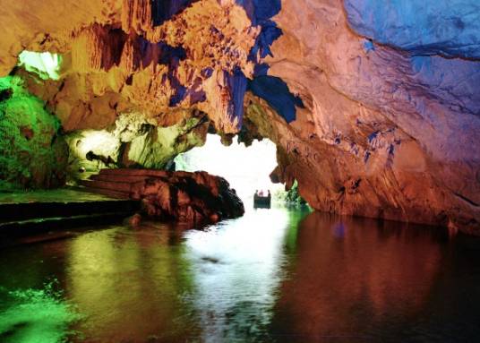 魚龍洞,與太平湖衣袂相連,距舉世聞名的黃山50公里,距佛教勝地九華山25公里,魚龍洞洞口如張開的鱷魚嘴,一泓碧水淙淙而出,終年不涸。該洞全長5000余米,有清澈的地下河貫穿始終,初極窄,復開闊,氣勢磅礴,宏偉觀,洞內奇石紛列,形態(tài)各異,或如蓮花綻放,或如玉樹臨風,或如眾僧朝圣,或如鐘鼓盤地,極為傳神,有東海、南海、北海、西海“四海“,及蓮花宮、月宮、慶喜宮、鯉魚宮、玉寢宮、白鱔宮、點將臺、犀牛宮、藏樂宮、天宮、聚寶宮”十一宮“,2014年5月新增了走路進,坐船出項目,使得游人既可徒步瀏覽,又可乘木舟漫游,奇妙的景色與水聲、波光、燈影交織成一團,撲朔迷離,意趣橫生。