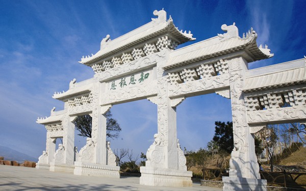 牌坊,一種中國(guó)特有的門洞式建筑,《現(xiàn)代漢語(yǔ)詞典》解釋為“形狀像牌樓的建筑物,舊時(shí)多用來(lái)表彰忠孝節(jié)義的人物”,現(xiàn)被視為中華文化的一個(gè)典型標(biāo)志。位于五千年文博園標(biāo)志性建筑盤龍下方的牌坊高9.6米,寬28米,以草白玉為材質(zhì),石砌整塊雕刻而成,上刻有趙樸初先生書法體“知恩報(bào)恩”四字,以此四字為做人準(zhǔn)則,來(lái)回報(bào)社會(huì)。