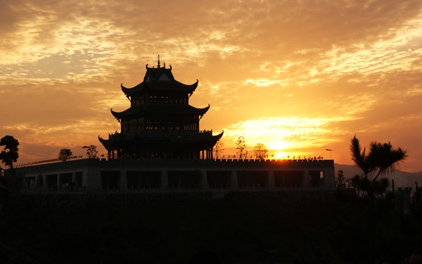 起名“問(wèn)天閣”,源于2000多年前中國(guó)詩(shī)人屈原對(duì)自然界和人生求索的名作——《天問(wèn)》,又因其為文博園最高建筑,問(wèn)天閣這個(gè)名稱就應(yīng)運(yùn)而生了。其座西面東,坐落在烽火臺(tái)座上,占地面積約3000平方米,為三層三重檐,呈方亭式,每面57米。