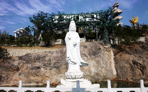 矗立于五千年文化長(zhǎng)廊的滴水觀音塑像,其高16米,由草白玉雕刻而成。她腳踩鰲魚,衣袖流暢,手持凈瓶,凈瓶盛裝著甘露,略帶笑意,具有無(wú)量的智慧和神通,普救人間疾苦。她的慈光,如同一輪皎潔的皓月,高懸夜空,普照大地,護(hù)佑著苦難眾生;其凈瓶中的甘露永流不息,滴水聲仿佛在向游人展示把那甘露灑至世界每一角落,流進(jìn)人們的心理,凈化世人的心靈,故有‘戶戶阿彌陀,家家觀世音!’的贊語(yǔ)。文博園的滴水觀音大氣端莊,生動(dòng)傳神,具有濃厚的民族性,是人類珍貴的文化藝術(shù)瑰寶。
