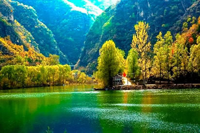 北京延慶烏龍峽谷景區(qū)——原名黑龍?zhí)。位于黑河的下游,屬距?.4億年前的中生代火山熔巖區(qū),全長2公里,是典型的山間河流深切河谷地貌景觀,峽谷兩側(cè)絕壁陡直、怪石林立,水聲轟鳴,浪花飛濺,以青山幽谷、碧水深潭遠近聞名。這里,懸崖陡壁,潭澗相連,依次為四潭、三潭、二潭、頭潭;其中,頭潭較闊,四潭最深。每年豐水時節(jié),峽谷內(nèi)奔涌的河水從幾十米高的懸崖上飛瀉而下,激蕩于山澗巨石之間,但見浪濤擊石,銀花飛濺,雷鳴般的濤聲如群獅怒吼,煞是壯觀。