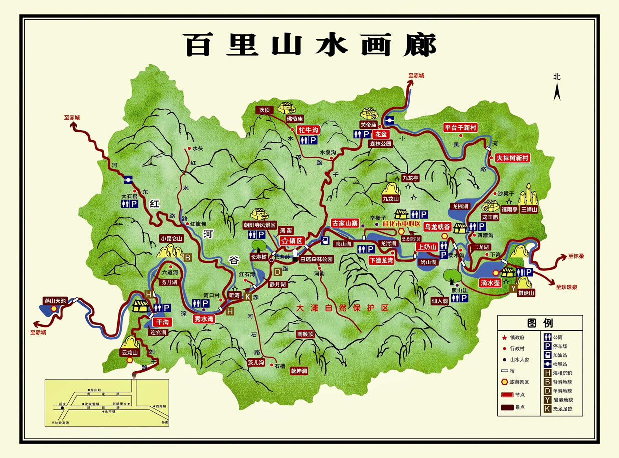 景區(qū)內(nèi)生態(tài)環(huán)境優(yōu)良,旅游資源豐富。風(fēng)光旖旎的白河谷地和壯美的黑河峽谷孕育了神奇的硅化木群、峻秀的滴水飛瀑、神秘的烏龍峽谷、莊嚴的朝陽寺、古老的關(guān)帝廟和蔥郁的大灘原始次生林等豐富的旅游資源,還有獨特的地質(zhì)景觀,如硅化木、單斜、背斜、穹窿、喀斯特地貌等。百里山水畫廊四季景色變幻如畫,是名副其實的避暑勝地和綠色氧吧。是休閑度假的絕好去處。畫廊”因此得名。