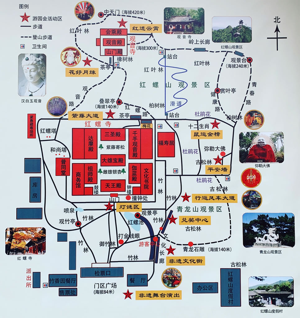 紅螺寺北依的紅螺山,南麓較平緩,有修砌的登山步道可到達紅螺山頂,極易游人攀登。山上的植被分柏樹林區(qū)、松樹林區(qū)、紅葉林區(qū),站在紅螺山之巔,舉目四望:南方是蒼茫無際的平原,田園、村落、城鎮(zhèn)鎮(zhèn)盡收眼底;西北是綿延無際的軍都山脈,在群山環(huán)繞、峰回路轉之間,萬里長城像巨龍一樣蜿紅螺寺風景圖蜒于群山之巔;向東眺望:雁棲湖、青龍峽的秀美景色盡收眼底。紅螺寺景區(qū)分紅螺山、紅螺寺、觀音寺、呈秀園、松林浴園、五百羅漢園六大景區(qū),又有“御竹”、“雌雄銀杏”、“紫藤寄松”三絕景點綴其間,人文景觀與自然景觀和諧完美地融合為一體,因而紅螺寺景區(qū)是人們禮佛拜祖、登山健身、觀光游覽、怡神靜心的好地方。
