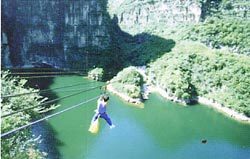 溜索飛降是登山探險(xiǎn)運(yùn)動(dòng)中,在通過懸崖、山澗、河流等地形時(shí)常用一種方法,F(xiàn)飛降裝置是經(jīng)改進(jìn)后,既安全又富有刺激,它容實(shí)用性和娛樂性于一體,在有驚無險(xiǎn)的情況下,既鍛煉了參與者的操作技能,又增強(qiáng)了他們的膽魄。龍慶峽飛降由國(guó)家登山隊(duì)承建,主要設(shè)備全部進(jìn)口材料,安全可靠,該項(xiàng)目在風(fēng)景怡人的龍慶峽內(nèi)兩山懸崖之間,上有藍(lán)天,下有碧水全長(zhǎng)200米,兩山自然落差30米的下滑時(shí)可使娛樂者感受到在空中飛越的感覺。