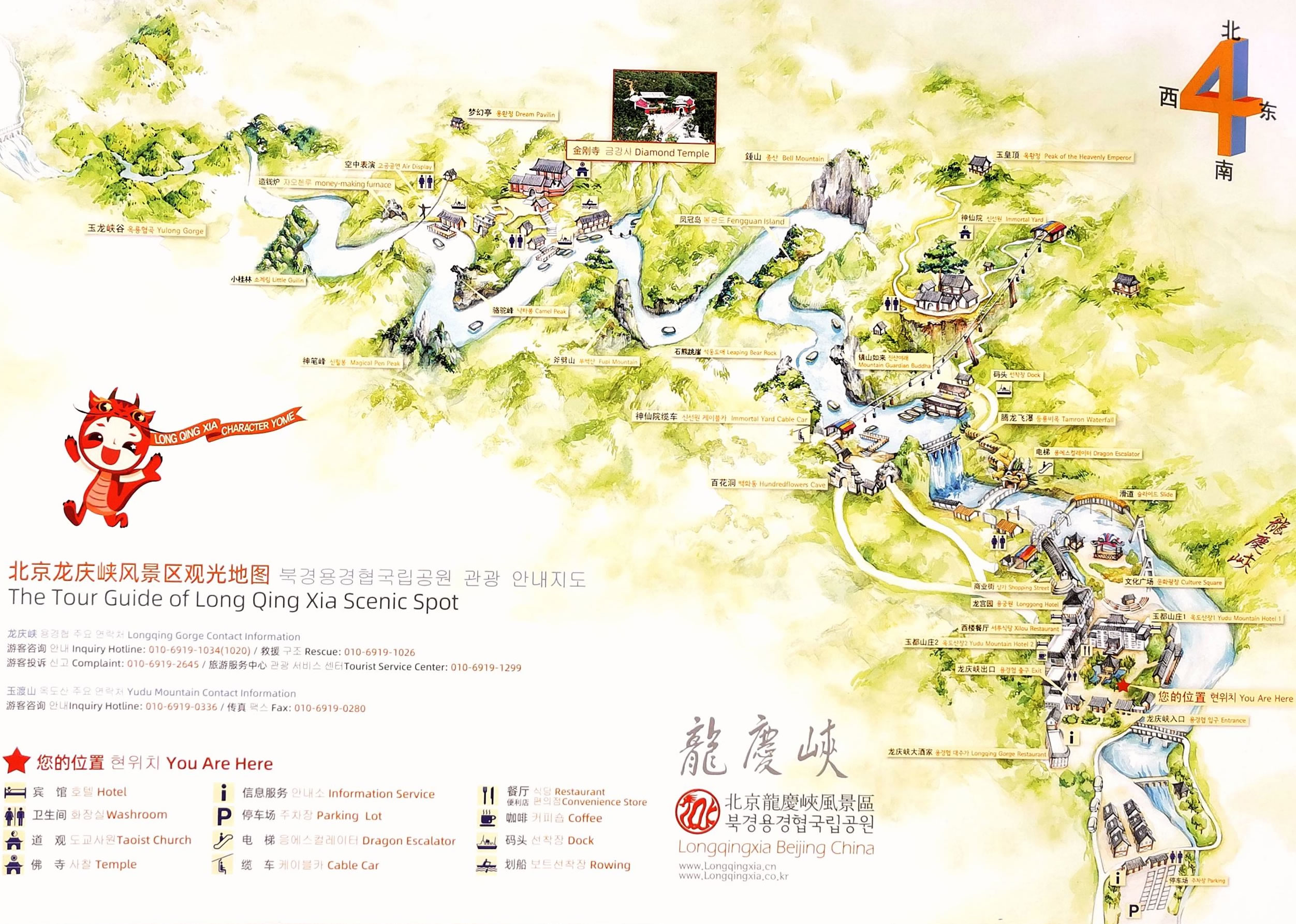 1986年北京評(píng)選十六景,得票居第十位,取其古地名兼寓龍騰之意,定名“龍慶峽”。龍慶峽南面為八達(dá)嶺長(zhǎng)城,西北為松山森林公園,正西是海坨山。7月份平均氣溫比延慶縣城低2.9度,比北京城區(qū)低6.4度。在已開放游覽的7公里長(zhǎng)的庫(kù)區(qū),共有20-30處景觀。游船駛抵“九曲湖”的一座小碼頭,可以棄舟登岸,沿山谷步行而上,有神仙院、仙人棋、老虎嘴等景點(diǎn)。