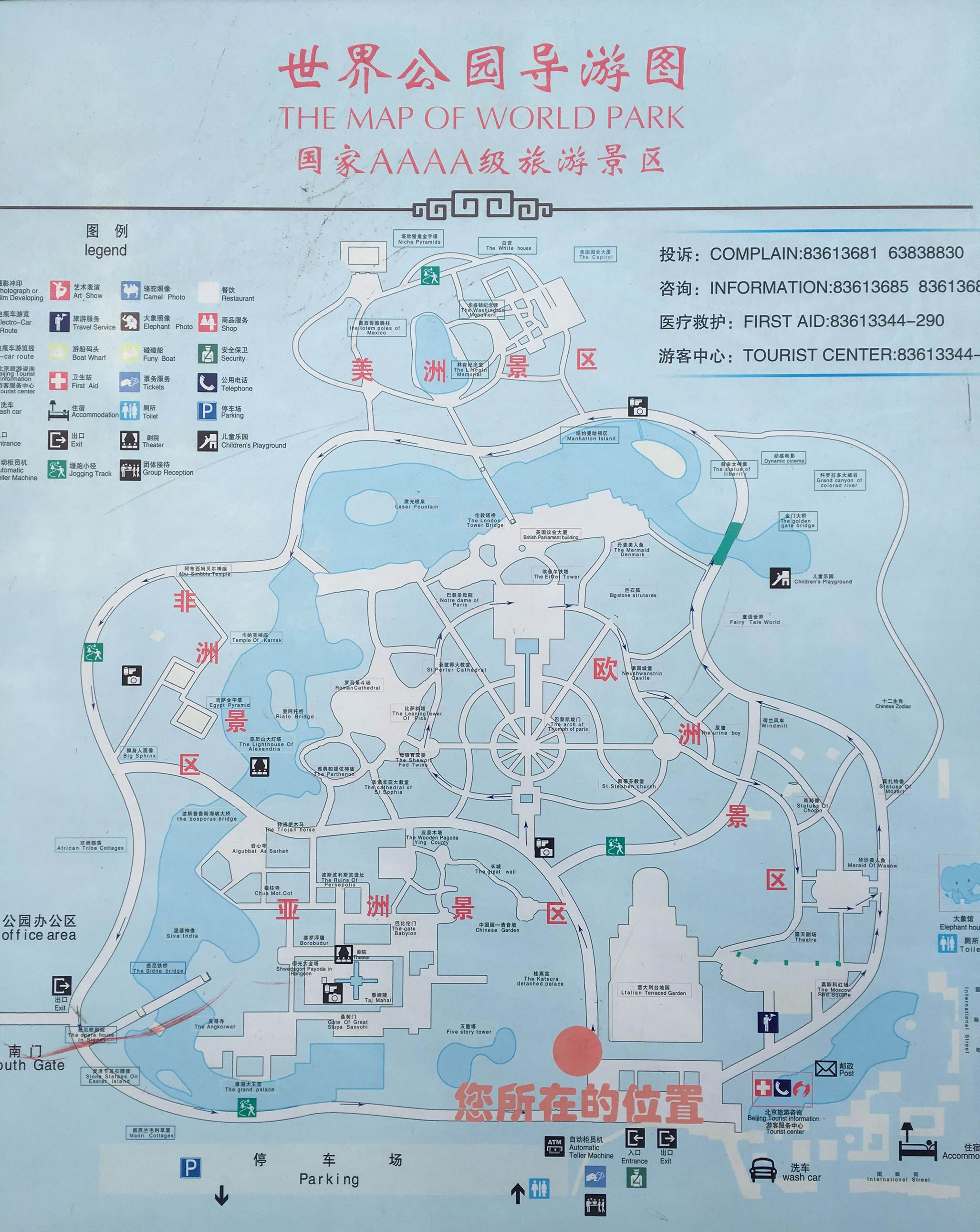 公園整體布局按照五大洲版圖劃分景區(qū),以世界上40個(gè) 國家的 109處著名古跡名勝的微縮景點(diǎn)為主體,薈萃了世界