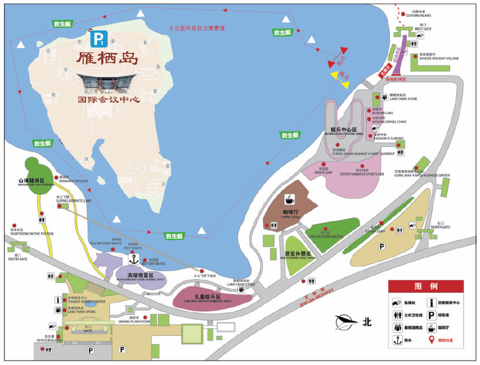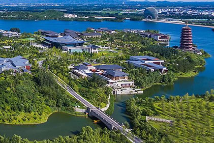 雁棲島上 核心是 雁棲湖國際會議中心。服務(wù)于大型會議。建筑主體是 “漢唐飛揚”,前面是夏園?偨ㄖ娣e4.2萬平方米,大小會議室、餐廳20余間,可以同時滿足近千人舉行會議和用餐。會議中心建筑內(nèi)部以H型為布局,功能核心區(qū)由位于一層的宴會廳——“鴻雁廳”和位于二層的會議大廳——“集賢廳”組成,兩側(cè)為貴賓大廳、休息區(qū)、大小會議室、包間等功能空間,宴會廳南側(cè)設(shè)室外宴會草坪,可以舉辦室外酒會等活動。