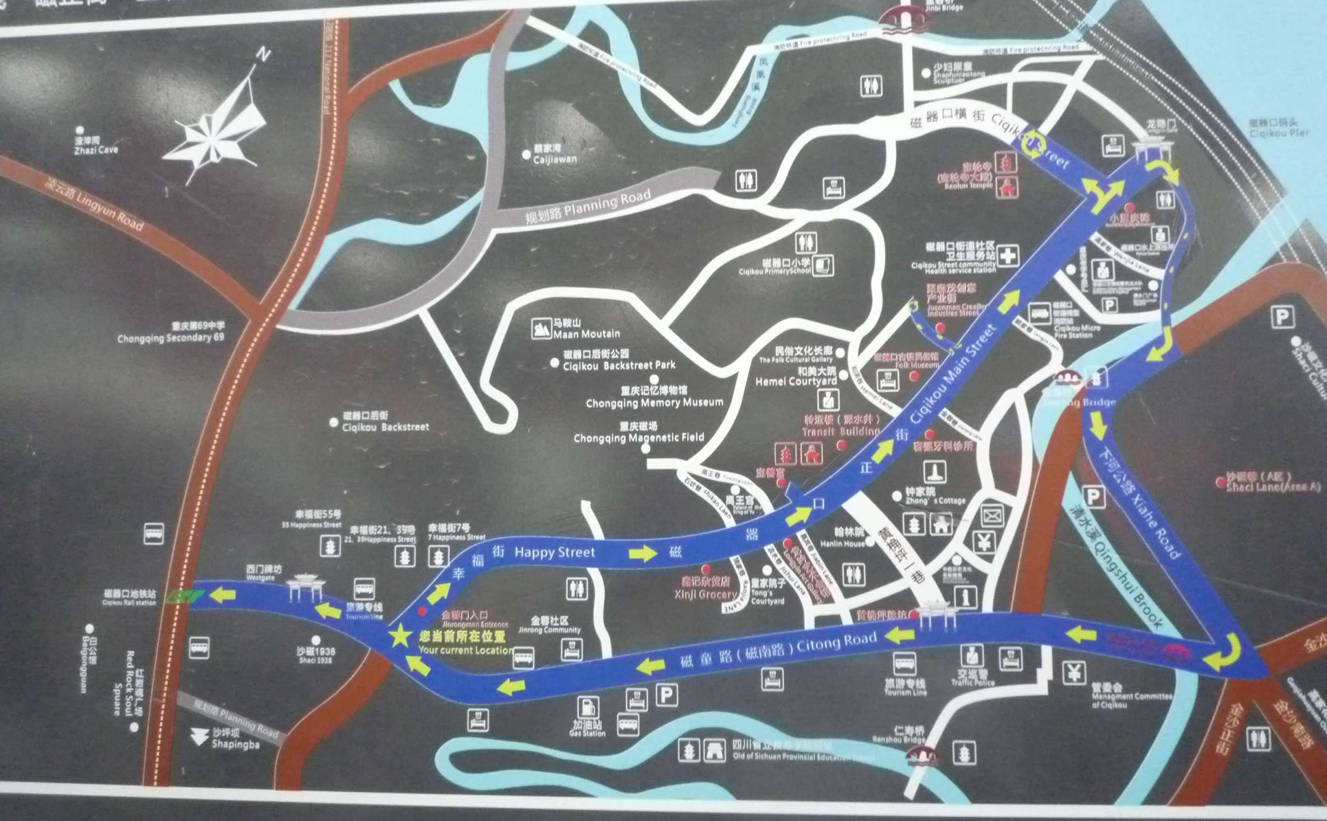磁器口古鎮(zhèn),原名龍隱鎮(zhèn),位于重慶市沙坪壩區(qū)磁南街1號,沙坪壩區(qū)東北部嘉陵江畔。北距沙坪壩中心5千米,重慶市中心14千米,南距石井坡3千米。磁器口古鎮(zhèn)總面積32.5萬平方米,其中保存完好的古鎮(zhèn)核心區(qū)14.3萬平方米,分布于馬鞍山東側(cè)和東南側(cè)。古鎮(zhèn)依山而建,由山起城。以磁器口正街和橫街為骨架,42條巷道垂直于正街和橫街向馬鞍山脊和溪溝邊緣呈枝狀發(fā)展,形成特征明顯的樹枝狀平面格局。正街和橫街寬3—6.5米,將嘉陵江水運碼頭、寶輪寺及外圍交通干道聯(lián)為一體。巷道寬1.5—4.5米,順應地形靈活布局,不拘一格,街道—巷道—宅院構成公共空間、半公共空間、私有空間的3級空間結構,形成清晰的街區(qū)社會組織的基本模式。
