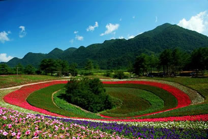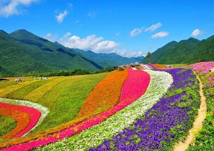 嫣彩織帶:各色鮮花呈帶狀鋪滿(mǎn),五顏六色,艷麗斑駁。一條條彩帶猶如多條絲綢鋪展在草地上,在綿延起伏的山脈下形成一片彩色的海洋。近百畝的帶狀簡(jiǎn)單構(gòu)圖,鋪天蓋地的霸氣給人豐富遐想,更像一條巨大的飄帶,給景區(qū)增加色彩的壯麗與斑斕。