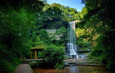 水口寺瀑布高94.18米,寬30米,最大的流量為每秒120多立方米,是四面山第四大高瀑。觀水口寺瀑布可經(jīng)過棧道到達(dá)瀑布背面平視瀑布,可從“九道拐”走下818步石梯于底端仰望瀑布。坐石觀景,四周奇石嶙峋,入目銀瀑飄飛,腳下流水潺潺,半山古樹盤扎。
