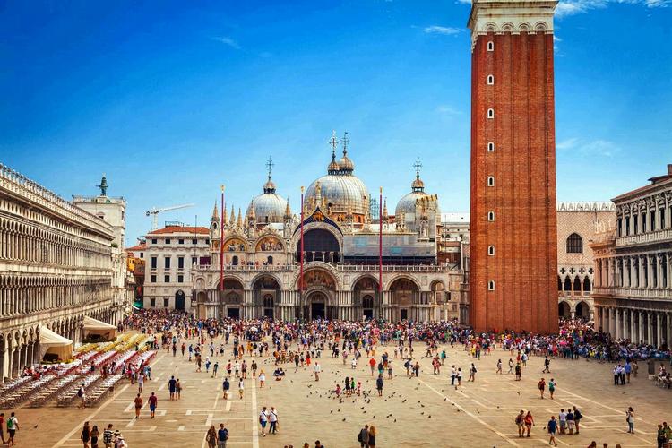 圣馬可廣場(chǎng) 圣馬可廣場(chǎng)(Piazza San Marco) ,官方標(biāo)準(zhǔn)譯名圣馬爾谷廣場(chǎng),又稱(chēng)威尼斯中心廣場(chǎng),一直是威尼斯的政治、宗教和傳統(tǒng)節(jié)日的公共活動(dòng)中心。圣馬可廣場(chǎng)是由公爵府、圣馬可大教堂、圣馬可鐘樓、新、舊行政官邸大樓、連接兩大樓的拿破侖翼大樓、圣馬可大教堂的四角形鐘樓和圣馬可圖書(shū)館等建筑和威尼斯大運(yùn)河所圍成的長(zhǎng)方形廣場(chǎng),長(zhǎng)約170米,東邊寬約80米,西側(cè)寬約55米。廣場(chǎng)四周的建筑從中世紀(jì)到文藝復(fù)興時(shí)代都有。 圣馬可廣場(chǎng)初建于9世紀(jì),當(dāng)時(shí)只是圣馬可大教堂前的一座小廣場(chǎng)。馬可是圣經(jīng)中《馬可福音》的作者,威尼斯人將他奉為守護(hù)神。相傳828年兩個(gè)威尼斯商人從埃及亞歷山大將耶穌圣徒馬可的遺骨偷運(yùn)到威尼斯,并在同一年為圣馬可興建教堂,教堂內(nèi)有圣馬可的陵墓,大教堂以圣馬可的名字命名,大教堂前的廣場(chǎng)也因此得名“圣馬可廣場(chǎng)”。