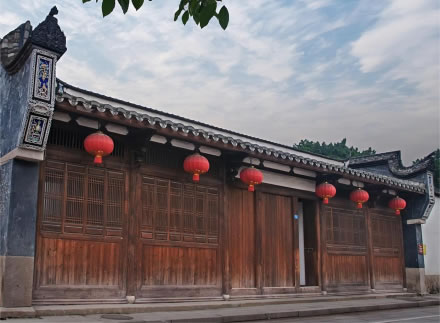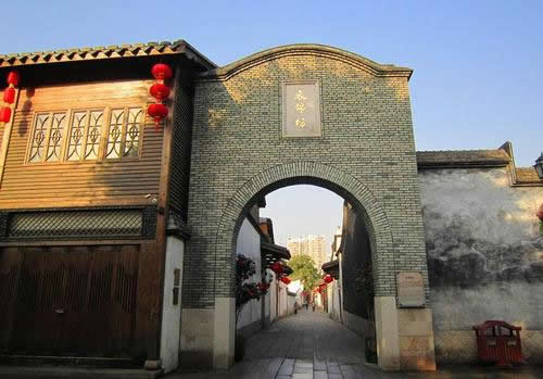 衣 錦坊是“三坊”中的第一坊,舊名通潮巷。據(jù)清《榕城考古略》記載:宋朝的“陸蘊(yùn)、陸藻兄弟典鄉(xiāng)郡居此,名祿錦,后王益祥致江東提刑任,更名衣錦!彼螘r(shí)稱“祿錦”,明朝更為“衣錦”,其實(shí)都是說坊內(nèi)有人在外出仕做大官,之后衣錦還鄉(xiāng),榮耀鄉(xiāng)里,所以坊名也改為了“衣錦”。過去稱“通潮”,則是因?yàn)檫@個(gè)地方是水網(wǎng)地區(qū),福州西湖、南湖的潮水可以通到這個(gè)坊巷的溝渠里去。坊中16號為清嘉慶進(jìn)士鄭鵬程居宅,其中的衣錦坊水榭戲臺最具特色。這是一個(gè)木構(gòu)單層平臺,四柱單開間,下建清水池塘,中隔天井,正面為閣樓。于此觀看戲劇演出,水清、風(fēng)清、音清,具有聲學(xué)原理和美學(xué)價(jià)值,是福州市現(xiàn)存的水榭戲臺。