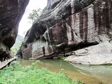 特殊地貌形成兩邊懸崖對峙,這條小澗叫桃花澗,從景區(qū)深處流出,我們的游路也將沿著高山峽谷的縫隙向內(nèi)延伸。桃源洞本沒有“洞”,無論是步行,還是泛舟游覽,都給人一種洞口的感覺右壁的懸崖高達(dá)120米,“桃源洞口”四個(gè)大字刻在36米高處,是明萬歷年間,辭官回永安的名士陳源湛于1605年所題,每字兩米見方。
