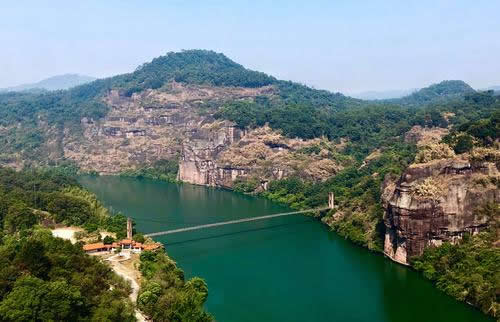 桃源洞因盛產(chǎn)栟櫚樹,古有栟櫚山之稱。風(fēng)景區(qū)起始于唐代,五代后晉年間建有寺廟,到了明代風(fēng)景區(qū)得到較大的發(fā)展。南宋宰相李綱和左正言鄧肅及明代大旅行家徐霞客都曾在此駐足并留有詩句。明代萬歷年間(公元1605年)當(dāng)?shù)匕采叭藘煽に抉R陳源湛捐資建有亭、臺、樓、閣十余處,取“世外桃源”之意改名為桃源洞,并在入口處120米高的赤壁上刻有“桃源洞口”四個(gè)大字,從此桃源洞名聞遐邇。這里丹霞地貌形成了眾多的奇峰峭壁,綠海林濤和碧水丹山。