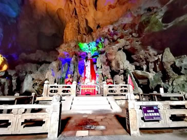 瑤池玉女: 高處懸掛著一盞巨大的宮燈,燈下是一塊巨石,石邊上立著一片長(zhǎng)條條、孤零零的石筍。繞到下方仰望,石頭斜傾,玉女剎那間變成在大風(fēng)大浪中奮力劃船的漁家婦女。還有人說(shuō)是莫愁女、是率眾仙渡海的觀音、是日本姑娘等。