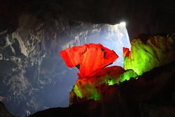 五更天: 前面“天際”出現(xiàn)魚(yú)肚白,邊上還有雄雞報(bào)曉石,接著,右前方洞頂閃爍著一顆啟明星。往前走,啟明星變成了半個(gè)月亮。在空氣濕度大、風(fēng)小、洞口外有陽(yáng)光的時(shí)候,半月旁還會(huì)出現(xiàn)一輪像彩虹一般的“佛光”。 |