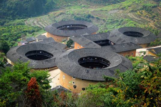 福建土樓產(chǎn)生于宋元,成熟于明末、清代和民國時(shí)期。土樓以石為基,以生土為主要原料,分層交錯(cuò)夯筑,配上竹木作墻骨牽拉,丁字交叉處則用木定型錨固。福建土樓或方或圓,以圓為主,如珍珠般灑落在閩西南的綠水青山間。福建土樓遵循了“天人合一”的東方哲學(xué)理念,就地取材,選址或依山就勢、或沿循溪流,建筑風(fēng)格古樸粗獷,形式優(yōu)美奇特,尺度適當(dāng),功能齊全實(shí)用,與青山、綠水、田園風(fēng)光相得益彰,組成了適宜的人居環(huán)境以及人與自然和諧統(tǒng)一的景觀。