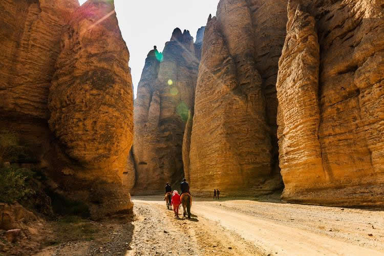 這里的石柱石筍大多高達(dá)八十至一百米之間,最高達(dá)二百多米,均由橘黃色砂礫巖構(gòu)成,鬼斧神工,猶如雕塑大師之夢(mèng)幻杰作。我們左行至飲馬溝入口,換乘當(dāng)?shù)剞r(nóng)民裝扮得極富民俗風(fēng)情的驢車(chē)前行。進(jìn)入峽谷,兩邊布滿了巨大的石筍、石人、石鐘、石崖、石窟,峰回路轉(zhuǎn),步移景變,人們將石景命名為:大象吸水、千帆競(jìng)發(fā)、伴侶駝、“黃河母親”等等,其形神兼?zhèn)洌蜩蛉缟?/p>
