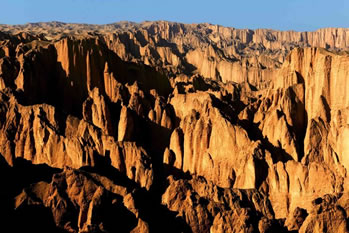 石林則依著黃河的彎轉(zhuǎn),藐著黃河的水流,這個(gè)場(chǎng)面保持著一種驚心動(dòng)魄的興奮,一看就是飛逝而去的千萬(wàn)年啊,千萬(wàn)年。老龍灣像一條長(zhǎng)長(zhǎng)的、波光粼粼的跑道,黃河拍打著細(xì)浪,從聳立的石林中,陡峭的巖石旁流過(guò)去,固執(zhí)地向干涸遙遠(yuǎn)的北方挺進(jìn)。風(fēng)吹過(guò),水涮過(guò),千萬(wàn)年的歲月,靈動(dòng)和冥想,一路歌舞狂歡。突然一剎那就是永恒。停在那里回轉(zhuǎn)的頭型,飄飛的發(fā)絲,閃逸的裙裾一下子被動(dòng)結(jié)了,面目間的笑意還沒(méi)有來(lái)及抹去。假如有一天,您也來(lái)到石林,是否會(huì)為這一片晴朗而遼闊的天空下毫無(wú)造作、天然凝就的靈魂而感動(dòng)和震撼?大自然的神筆飛揚(yáng),你縱然放開(kāi)想象,馳騁神思。望尖銳或圓錐狀的山峰,基部相連的簇狀,是石林發(fā)育地貌形態(tài)。只要能夠聯(lián)想到的物象,毫無(wú)例外活生生矗立在你的眼前,仰觀景慕,活靈神現(xiàn);你沒(méi)有想到的也一幕幕向你襲來(lái),目不暇接。山峰如聚,峰嶺沸騰了一般,黃河石林以它非石非巖的特質(zhì),在這塊土地上托起一個(gè)立體的神話。雅丹、丹霞、峰林為一體的地貌奇觀寫(xiě)意了恢弘的場(chǎng)景,刀鋒擁擠,千軍涌動(dòng),萬(wàn)馬奔騰,這儼如一個(gè)拼殺的戰(zhàn)場(chǎng),風(fēng)行走其間鼓動(dòng)著金屬碰撞的鏗鏘,它不再是一個(gè)夸張的舞臺(tái),場(chǎng)面不再是一個(gè)宏大的舞池。穿越石林,我們不自主地感知黃土高原的陽(yáng)剛的軀身,緘默的神態(tài),堅(jiān)毅的面容,它在風(fēng)雨中矗立,日復(fù)一日,從不愿放棄對(duì)大地的眷戀,對(duì)太陽(yáng)的向往。
