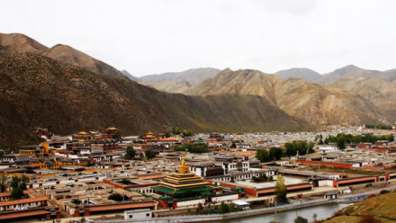 寺院坐北向南,占地總面積86.6萬(wàn)平方米,建筑面積40余萬(wàn)平方米,主要殿宇90多座,包括六大學(xué)院、16處佛殿、18處昂欠(大活佛宮邸)、僧舍及講經(jīng)壇、法苑、印經(jīng)院、佛塔等,形成了一組具有藏族特色的宏偉建筑群,房屋不下萬(wàn)間。