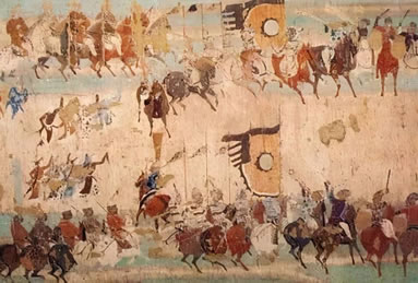 敦煌作為中西交通的樞紐,在壁畫上不僅留下了商旅來往的活動情況,還留下了寶貴的交通工具的形象資料。他們有牛馬駝騾、驢象舟船、車轎輿輦等。常用的交通工具車輛類型各異,牛車有“通牛車”、“偏牛車”、敞篷牛車,馬車有駟車、駱車,還有駱駝車、童車、獨(dú)輪車等,特別是保存了中國為世界交通做出獨(dú)有貢獻(xiàn)的獨(dú)輪車、馬套挽具(胸帶挽具和肩套挽具)、馬蹬、馬蹄釘掌等珍貴的圖像數(shù)據(jù)。西魏第285窟、北周第296窟五百盲賊皈依故事畫,表現(xiàn)了騎著戰(zhàn)馬的騎兵,與身穿褲褶的步兵(強(qiáng)盜)作戰(zhàn)的場面,畫面上畫出了馬鎧,它是保護(hù)戰(zhàn)馬的防護(hù)裝備,古稱具裝,或具裝鎧。第285窟馬鎧的形制齊全,從保護(hù)馬頭的“面簾”、到保護(hù)馬鞍后尻部的“寄生”一應(yīng)俱全。反映了漢代已有的具裝,到北朝時期已發(fā)展為玩唄成熟的保護(hù)裝備。馬鎧的產(chǎn)生和發(fā)展是中國為世界軍事裝備所作的獨(dú)有貢獻(xiàn)。
