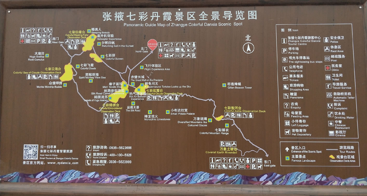 七彩丹霞景區(qū)內(nèi)有七彩云海、七彩仙緣、七彩錦繡、七彩虹霞、最佳攝影點、七彩熬河臺、萬象土林谷等7處觀景臺。登臨攬勝,薄層狀泥巖、砂質(zhì)泥巖及頁巖互層交錯,紫紅色、灰綠色、黃綠色、灰黑色等色彩交相輝映,組合有序,極富有韻律感和層次感。神龍戲火、靈猴觀海、眾僧拜佛、大扇貝、七彩屏、睡美人等景點。七彩丹霞景區(qū)集自然和獨特的人文景觀于一體,體現(xiàn)了西部特有的粗獷雄奇,瑰麗險絕,氣象萬千。