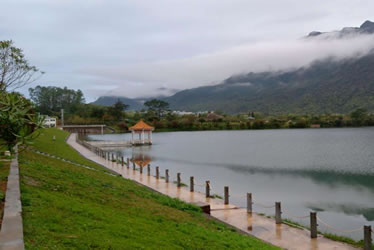 白水寨地處降雨頻密的增城北部山區(qū),充沛的降雨量不僅造就了中國內(nèi)陸第一高瀑的氣勢磅礴,也為白水寨帶來了美不勝收的湖泊風(fēng)光。瀑布從428.5米的山上飛流直下,氣勢磅礴,蔚為壯觀。瀑布源頭蒼翠、險峻的群山環(huán)抱,仙姑天湖和七仙湖就像碧綠的翡翠般鑲嵌在層林疊翠間,這兩個大型的高山湖泊總?cè)萘窟_480萬立方米。在白水寨山下,瀑布流水又匯聚成一個天然的湖泊。湖水清澈,晶瑩如玉,晴朗之際,湖面宛若明鏡,將旁邊的青山密林、綠草紅花倒映其中,美不勝收。