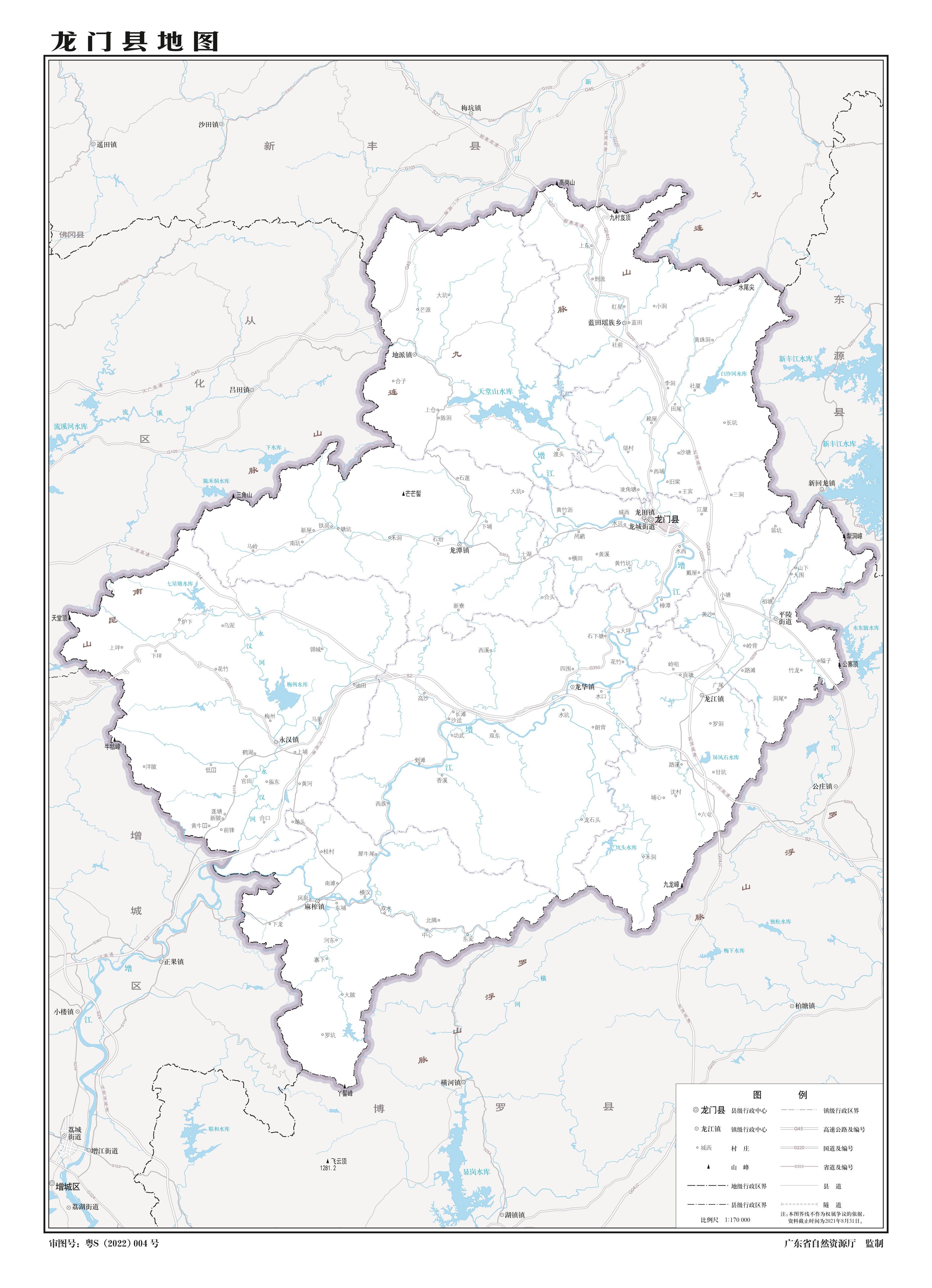 位置境域 龍門縣位于廣東省中部,增江上游,地處珠江三角洲邊緣,東南與河源市、博羅縣接壤,西南與從化市、增城市毗鄰,北與新豐縣相連。行政區(qū)域位于東經(jīng)113°48′26〞—114°24′58〞,北緯23°20′06〞—23°57′50〞之間?h內(nèi)土地廣闊,地勢(shì)自西北向東南傾斜,全縣總面積2267.2平方公里。