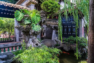 船廳前有兩口池塘,似將樓船浮在水中,船尾有丫環(huán)樓,船頭栽有一株沙柳,柳邊有一紫藤。船廳后邊,還有一株白木棉樹,以其花淡黃近白而稱奇,另有一棵單株結(jié)果的百年銀杏。與船廳跰足而建的惜蔭書屋和真硯齋,惜蔭書屋和真硯齋是供公子、小姐們讀書的場所。