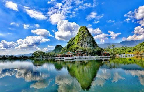 七星巖以喀斯特溶巖地貌的巖峰、湖泊景觀為主要特色,七座排列如北斗七星的石灰?guī)r巖峰巧布在面積達6.3平方公里的湖面上,20余公里長的湖堤把湖面分割成五大湖,風(fēng)光旖旎。被譽為“人間仙境”、“嶺南第一奇觀”。