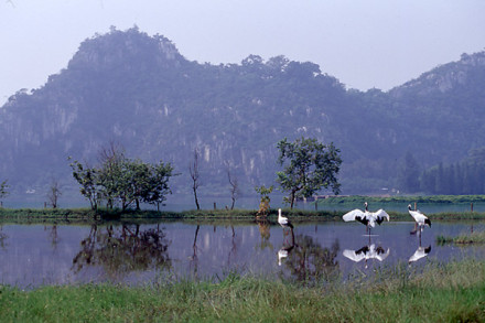 “丹頂鶴生態(tài)園”有丹頂鶴50多只,它們身姿高雅而端莊,兩翅不時輕舒慢舞,引著修長婀娜的脖子,偶而亭亭玉立,偶而輕盈踱步。它們時而高歌,時而飛翔,像是歡迎遠道而來的客人。仙女湖中幾個自然的候鳥群島,它們由四個小島組成,分別名曰:藏珠、瑤玉、云起和小瀛洲。這四個小島和一旁的招鳥島以及小島周圍半徑150米水域范圍被列為生態(tài)絕對保護區(qū)。