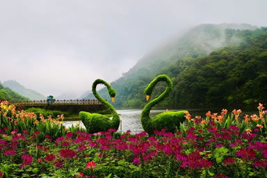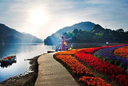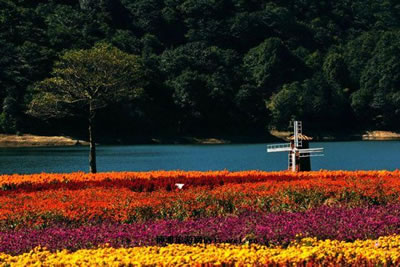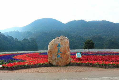 “七彩天池”花海是石灶風(fēng)光區(qū)的天池花海景點(diǎn)國(guó)慶期間的一個(gè)特色,由多種顏色的花卉共同組成。大紅色的一串紅、金黃色的硫化菊、紫色的千日紅、橙色的百日草、深紅色的紅穗冠、淡黃色的黃穗冠和粉色的朱唇等匯聚成一道亮麗的彩虹,降落在藍(lán)天碧水之間,創(chuàng)造出一個(gè)七彩斑斕的童話世界。同時(shí),圍繞著這七色花海還有大波斯菊與醉蝶花。紅的,粉的,紫的,白的小花配以音樂(lè)等元素造型共同點(diǎn)綴著這幅優(yōu)美的畫(huà)卷。“七彩天池”最佳觀賞期為9-11月。