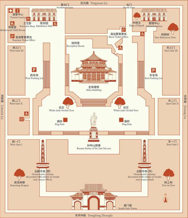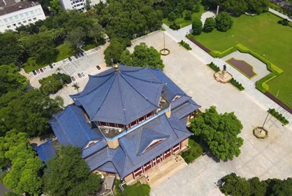 從空中俯視,紀(jì)念堂呈外突的傘型結(jié)構(gòu),青磚藍(lán)瓦藍(lán)象征著孫中山先生當(dāng)年。