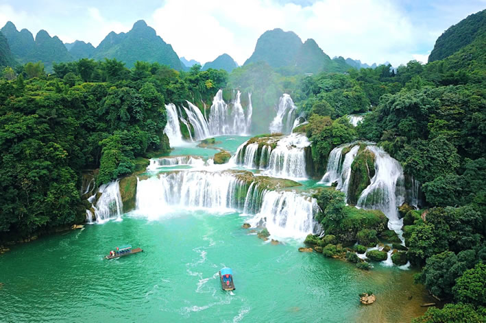 德天跨國瀑布位于祖國西南邊陲——廣西崇左市大新縣,開門是越南,跨步進東盟,是2015年11月中越兩國總書記見證簽約的中國首個跨境旅游合作區(qū)。距廣西首府南寧約196公里,距大新縣57公里,距紅色革命老區(qū)百色188公里,奇特的喀斯特地貌和自然山水風(fēng)光,被稱為中越邊境的百里山水畫廊。景區(qū)占地面積約5.75平方公里,橫跨中越兩國,形成中國的德天瀑布,越南的板約瀑布。因景觀獨特被譽為亞洲第一大跨國瀑布、中國最美的六大瀑布。