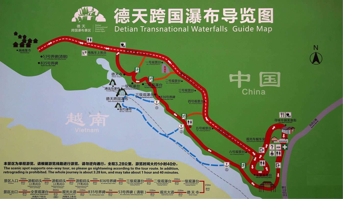 除了瀑布以外,德天景區(qū)一帶還有明仕田園風(fēng)光、沙屯的多級(jí)疊瀑、奇峰夾峙的黑水河,綺麗多姿的那岸奇景,雷平石林、恩城山水、中越邊境53號(hào)界碑等景點(diǎn),更有那云霧飄渺的群英會(huì)德天五百里畫廊,遍布紅棉翠竹和民居水車的田園美景。