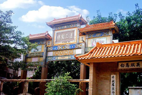 平南縣城東七十里的白馬圩風(fēng)景區(qū)。該處有明督師袁崇煥故里和南漢梁嵩狀元廟遺址。梁嵩為五代南漢時人,經(jīng)苦學(xué)考取狀元及第,仕至翰林學(xué)士,因不滿虐政,辭官歸里,過白馬東濠河溺歿,州人感其請蠲免龔州丁賦之德,立廟以祀。袁崇煥詔授兵部尚書兼三邊總制時,曾在家鄉(xiāng)平南白馬建有“總制三邊坊”。1986年,在白馬圩重建改建了“袁崇煥總制三邊坊”和“梁嵩紀念館”,與巍巍辰嶺,悠悠碧水,互相輝映,殊為壯觀