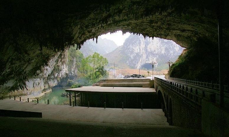 穿龍巖,位于縣城內(nèi)西北面,因其古時候?yàn)槁啡瞬叫腥氤堑谋亟?jīng)之道而又名鳳陽關(guān)。其西南面石壁高約180m,130m處有一小溶洞,被稱作鳳山的“鳳眼”,夕陽晚照,滿壁金光,為鳳山八景之一“丹崖晚照”。穿龍巖南面洞口寬約80m,高約30m,其中河床寬約20m。整個穿龍巖最寬約200m(含河床寬度),深度為400m,最高高度約100m,洞廳面積4.15萬平方米,排名中國第五。