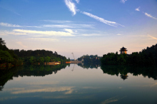 靈湖是一個(gè)自然湖泊,素有小西湖之美譽(yù),湖面寬780畝,其最深的地方可達(dá)30米。其水來自廣西靈川縣海洋鄉(xiāng)的海洋河。水質(zhì)清澈冰涼,四周青松翠柏倒影湖中,猶如一幅淡淡的山水潑墨畫。“水光瀲滟晴方好,山色空蒙雨亦奇”