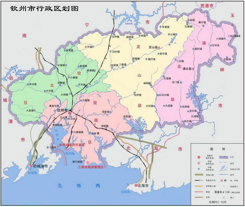 2010年11月,國務院批準欽州港經(jīng)濟開發(fā)區(qū)升級為國家級經(jīng)濟技術開發(fā)區(qū)。欽南區(qū)、欽北區(qū)、欽州港經(jīng)濟技術開發(fā)區(qū)、三娘灣旅游管理區(qū)、靈山縣、浦北縣等均為欽州市轄域。