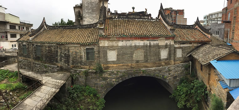 登龍橋在西河流向圭江的入口處。據(jù)資料記載,該橋始建于宋元年,全長36.3米,拱跨10米,高5.5米,寬13.5米。橋面一邊為橋的通道,中間建風雨亭,為歇山頂磚木結構;一邊建殿堂,青磚砌墻,青瓦覆蓋,硬山頂磚木結構。頂部磚砌灰雕花脊,兩端飾鰲魚,中間為火球。殿內墻端繪飾古壁畫,園木柱作頂柱。橋東牌坊上刻著“登龍橋”三個大字,整座建筑風格獨特,莊重樸實。為北流八景之“龍橋夜月”所在。