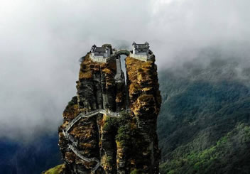 新金頂海拔2336米,垂直高差達(dá)百米,是三座金頂中最險的一座。晨間經(jīng)常被紅云瑞氣圍繞,因此也被稱為紅云金頂,諧音“鴻運(yùn)金頂”,有鴻運(yùn)當(dāng)頭的的寓意。新金頂上半部分被“金刀峽”隔成兩座孤峰——南面建有釋迦殿,供奉釋迦佛;北面建有彌勒殿,供奉彌勒佛。中間由天橋連接,狀若飛龍。紅云金頂從不同角度觀看,分別似佛手二指禪,也像生命的圖騰,因此又被稱為“天下第一峰”。