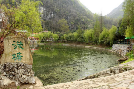 漩塘是國家級風(fēng)景名勝區(qū),在龍宮的上游。一個(gè)面積達(dá)萬余平方米的圓塘,池水不借風(fēng)力,日日夜夜、年年歲歲永不停歇地沿著順時(shí)針方向旋轉(zhuǎn)著。景象珍奇,令游客陶醉。通漩河的水流到這里便沉入地下,變?yōu)榈叵掳岛印L撩娉蕡A形,一年四季塘水以順時(shí)針方向,挾帶水上綠色浮萍不停地漩轉(zhuǎn),終年不息。