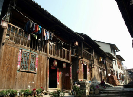 早期的民居建筑也大多還保留著漢文化的特點(diǎn),以安徽、江西居多,其建筑形式、藝術(shù)手法均具明顯的徽派建筑特點(diǎn)。民居的基本單元一般為開(kāi)間10米(三間開(kāi)),進(jìn)深8米左右的兩到三層木構(gòu)建筑。建筑結(jié)構(gòu)采用穿斗式人字形坡頂,蓋小青瓦,外圍磚墻或泥石墻,頂部做成迭落形,端部做成馬頭狀,俗稱“馬頭墻”。屋檐出水向外挑出30厘米,采用“雙重脊檐”形式,青色的披檐鑲嵌在灰白色磚墻上。宅基均高出地面1米,房屋之間相對(duì)排列整齊有序,每家每戶前均有清一色的幾階青石臺(tái)基排列,大門(mén)上掛有標(biāo)志著屋主籍貫、身份的匾額,如“關(guān)西第”、“科甲第”、“洛陽(yáng)第”等,且大門(mén)外墻呈“外八字”結(jié)構(gòu),其平面布置自外而內(nèi),先門(mén)第,再前屋,再正屋、后屋,每一屋均由天井相隔,天井以青石鋪就,低于臺(tái)基,天井內(nèi)放有青石制成的防火缸,缸上雕龍或飾有古代兵器戟,內(nèi)有暗溝以便排水,古鎮(zhèn)民居內(nèi)每戶必有一后門(mén),且后門(mén)戶戶相通,目的是為了軍人家眷躲避戰(zhàn)火,戰(zhàn)事來(lái)臨時(shí)家家互相通告,由后門(mén)撤離至安全地帶。