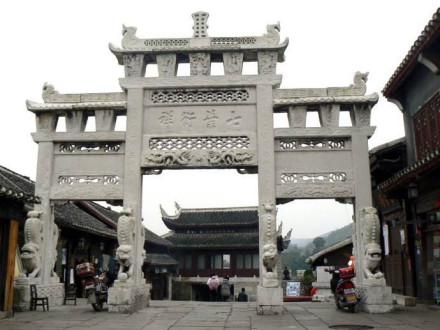 青巖古鎮(zhèn)城中原有八座牌坊橫跨在石板鋪筑的大街上,如今尚存兩座百歲坊和一座貞節(jié)牌坊。定廣門內(nèi)的趙理倫百歲坊,是清道光二十三年(1843年)奉旨建造的。它是一座四柱三間、三樓四阿頂?shù)氖品,?.5米,寬約9米。精心雕琢的石牌坊,在藍天白云之中,顯得空靈。正中的橫額上,鐫刻著道光皇帝的題額,正面是“七葉衍祥”,背面是“升平人瑞”,上端有“欽賜”二字。抱柱的四對石獅子非同尋常,不是站獅,也不是臥獅或蹲獅。八頭獅子仿佛是從高山上俯沖下來,富有靈性。