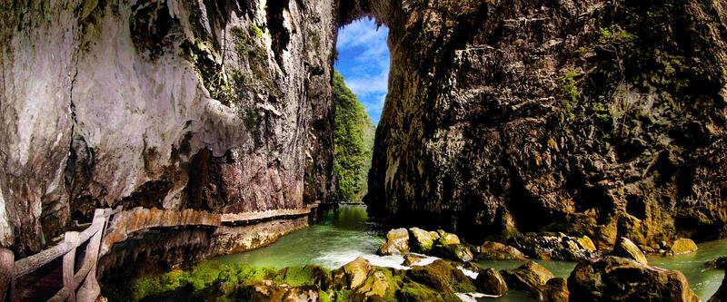 天生橋是一座喀斯特天然橋,橋高73米,厚15米,寬約22米。石橋雄奇?zhèn),橋下湍急的河水跌落成一?米高的瀑布,橋上鐘乳石斑斑點點,橋面樹木叢生,單孔石橋同兩岸山渾然一體,天衣無縫,被人稱為大自然神力塑造的“東方凱旋門”。