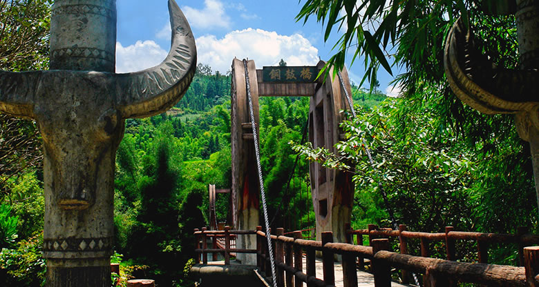 橋長126米,凈跨60米,寬2.4米,高25米,橋身兩端采用瑤山瑤族銅鼓造型,瑤族將銅鼓視為神賜之物,鎮(zhèn)寨之寶,是權(quán)力的象征。橋頭設(shè)立的圖騰柱代表著瑤族的尊嚴(yán)和崇拜,柱身上的浮雕圖案展示了瑤族傳統(tǒng)、獨特而古老的民族文化,具有濃郁的地方民族特色。