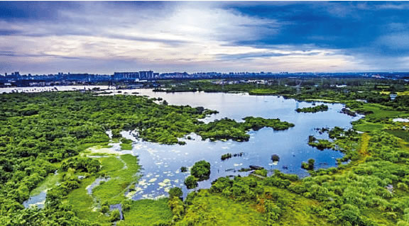 ?谖逶春訃覞竦毓珗@,南起永莊水庫,北至五源河河口海域,主要包括永莊水庫、五源河及河口海域3個濕地單元,規(guī)劃面積1300公頃(1.95萬畝),其中濕地面積958公頃(1.44萬畝),有4個濕地類及10個濕地型,濕地率為73.69%。公園內(nèi)共有野生維管束植物96科318屬427種,其中水蕨為國家二級保護植物。共有野生脊椎動物25目66科154種,其中國家Ⅱ級重點保護野生動物多達11種。五源河上游的永莊水庫及周邊大面積的火山熔巖濕地和灌叢沼澤區(qū),是?谑袇^(qū)內(nèi)自然生態(tài)保存較為完好的區(qū)域,擁有城市內(nèi)稀缺的動物棲息地和植被生態(tài)環(huán)境。