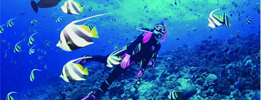 潛水是海南的主要水上運動項目。海南島海域廣闊,港灣眾多,波平浪靜,海水清澈見底,海底平坦,海底生物繁多。是進行潛水的“絕佳之處”。游客可參加潛水運動,觀賞海底珊瑚、海洋生物和地震陷落海底村莊。